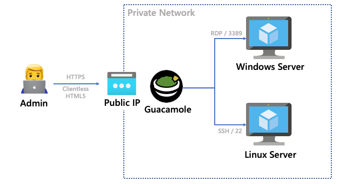 Au bureau, en télétravail ou en déplacement, Guacamole vous permet d’accéder à vos serveurs et équipements réseau en toute sécurité, depuis n’importe quel navigateur web.